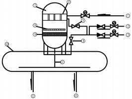 方案三:以上解决旋膜式除氧器在机组极热态启动过程中消除旋膜式除氧器振动的方案都不十分完美,还存在缺陷。因此,经过不断地总结和尝试,终找出了如下的解决方案,该方案的要点是在机组极热态启动过程中旋膜式除氧器的补充水要加热,还要维持除氧器内部的压力正常,且除氧器内的水温要达到除氧器内压力相应的饱和温度,根据机组极热态启动引起旋膜式除氧器振动的原因分析一点可知,引起旋膜式除氧头⑦和凝结水至除氧头管道①振动的原因是由蒸汽进入到冷水管道中,从旋膜式除氧器的结构中可知,进入除氧头的蒸汽有两个路径,一路蒸汽是加热旋膜管⑥下来的水,二路蒸汽是加热淋水蓖子⑧下来的水。