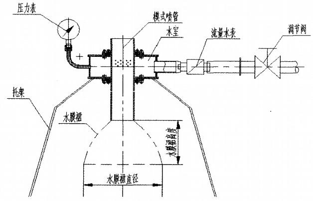 2.3.1采用φ108×4.5mm,L=480mm的旋膜喷管进行试验,对以下测试要求及数据应做详细记录。进水压力与压差的关系;流量与射流品质的关系;记录射流长度、角度、水膜裙终端直径及高度;目测水膜厚度与粒度;以流量表及时间计算流量吨位。