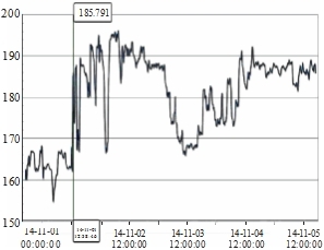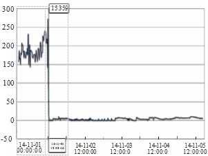 当机组停运切换操作时,除氧头超温现象更加明显。2014年11月1日,#7机组停机操作时,运行中的#10旋膜式除氧器除氧头温度突然升高。调取DCS运行过程中旋膜式除氧器温度变化曲线,见图1。由图1可见,#10除氧头温度在2014年11月1日12:38突然升高,高达195℃,已超出了工艺控制范围。再调出同一时间段#7机的凝结水退出时的流量变化曲线进行比对,见图2。