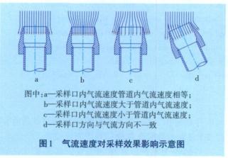 不同粒径的飞灰颗粒含有的可燃物量不同,为了使其具有代表性,取样时取样管应保持等速取样工况,即吸入取样管口内气流速度与其周围环境气流速度相等。取样管非等速工况或管口未正对气流方向时,细粒飞灰受流束运动力作用,易改变原来的运动轨迹,而粗粒飞灰受惯性力作用继续保持原来的运动轨迹,使得所采集的飞灰试样粗细颗粒成分与实际飞灰形成误差,导致采集到的飞灰样品缺乏代表性。气流速度对采样效果影响示意图见图1。