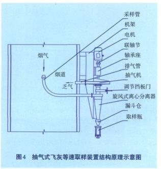 该飞灰取样器装置由等速采样枪、旋风式离心分离器、取样瓶、涡轮抽气机、调节挡板门、轴承座、电动机、控制电路等部件组成。其中旋风式离心分离器抽气管经调节挡板门与涡轮抽气机进气口连接,排气口与烟道相通,将分离后的清洁空气排入烟道。抽气式飞灰等速取样器装置结构原理图见图4。
