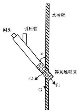 电厂一期炉膛压力煤粉取样器装置采用PFD-1(Y)型防堵风压煤粉取样器,安装示意如图2所示。煤粉取样器与炉墙间的夹角为30度左右,也就是与水平角度约为60度,符合规程规定的“与水平角度不得小于45度”的要求。这样设计的目的是,利用煤粉取样器跟水冷壁的夹角a越小,沿煤粉取样器向炉膛内的重力分量F1就越大的力学原理,见图2的力学分析所示:F1=G×cosa可见,根据以上原理分析,当煤粉取样器内出现浮灰的堆积时,浮灰在重力分量F1的作用下,应该会自动滑落至炉膛内,从而达到防堵的目的。但从实际的应用效果看,却根本无法达到这种防堵的效果。原来炉膛内环境较为干燥并且到处充斥着浮灰,浮灰会随着炉膛内烟气的流动发生相互碰撞和摩擦而带上一定量的电荷,这样部分浮灰会相互吸引、沉积并吸附在煤粉取样器内,另外大部分的浮灰是松散状态的,在堆叠过程中出现的不稳定部分会自动散落在其它较为稳定的浮灰周围,这些散落的浮灰又反过来加固了相对稳定的浮灰,时间长了会缓慢堆高并变得稳定。这样的堆积方式,形如山坡上形成的积雪,因为在底部形成一个非常稳定的大钝角三角形结构,当浮灰逐渐堆积起来后,自然形成一个较为稳定的堆积物而不容易滑落,终在取样管内大量沉积堆高进而导致堵塞。