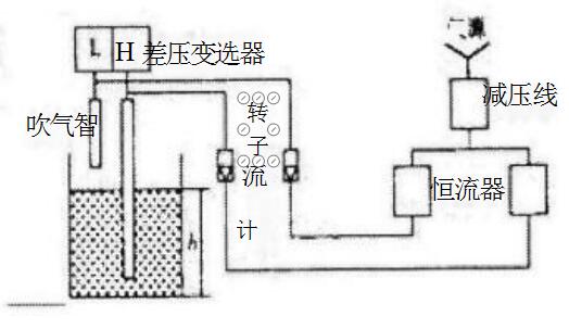 净化后的压缩空气经过减压阀后,进入恒流器,再经过转子流量计后,以一定流量均匀地送入吹气测量管,当长吹气测量管内气体压力高于其下端到液面的液柱静压时,该吹气测量管下端便连续不断地吹出气泡,由于吹气量很小,在忽略管道阻力等其它影响因素的情况下,可以认为差压变送器的高压腔所受的压力等于长吹气测量管内的压力。由于另外一个吹气测量管插入较浅且不和液体接触,虽然有一定流量的气体通过,但是在忽略了管道阻力等因素影响的情况下,差压变送器低压腔所受的压力就等于大气压力(测量环境在常压时),即不受压力。因此,差压变送器所测量的差压值△P就等于长吹气测量管下端到液面的液柱静压值。这就是吹气测量法的基本原理,该测量原理在真空测量系统中同样适用。
