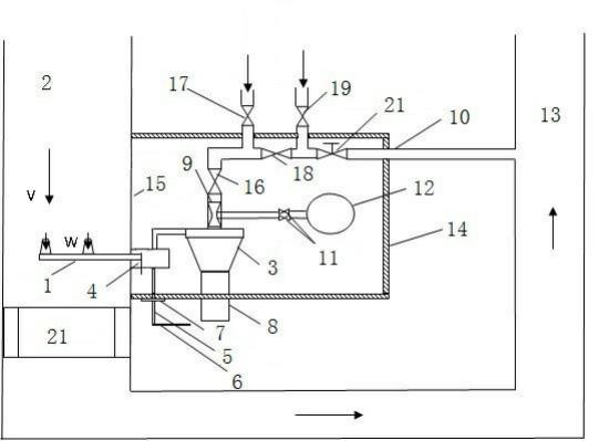 其中,1、取样枪;2、空气预热器入口烟道;3、旋风分离装置;4、旋转底座;5、转动轴;6、转动手柄;7、刻度盘;8、飞灰储存罐;9、文丘里测风装置;10、回气管路;11、差压表隔离阀门;12、差压表;13、电除尘器入口烟道;14、保温箱;15、空气预热器入口烟道外壁;16、旋风分离装置隔离阀、17、热一次风开关阀;18、回气管路开关阀;19压缩空气开关阀;20、烟气流量调节阀;21、空气预热器。
