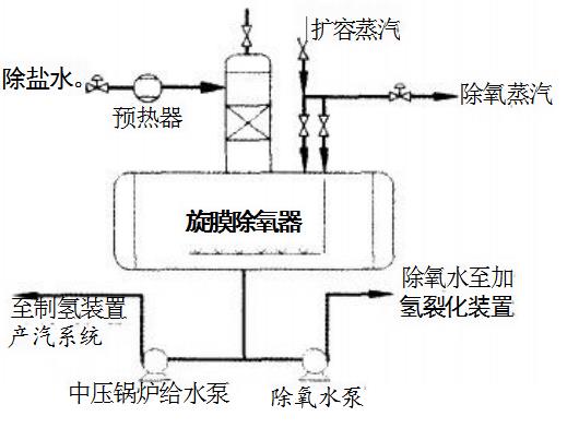 自装置外来的除盐水经调节阀后由除盐水预热器预热至95℃左右,从上部进入热力除氧器及水箱。热力除氧器正常运行时,除氧用热源来自排污扩容器扩容的二次蒸汽;同时通过调节1.0MPa(G)低压蒸汽的流量来控制热力除氧器的压力,达到除氧的目的。除氧后的除氧水供给加氢裂化装置和制氢装置。制氢装置需要的除氧水经中压锅炉给水泵升压,一部分预热后送至中压产汽系统,另一部分作为装置急冷用水,送往各用水点。加氢裂化装置需要的除氧水经除氧水泵升压送至加氢裂化装置内。除氧水系统流程示意见图1。