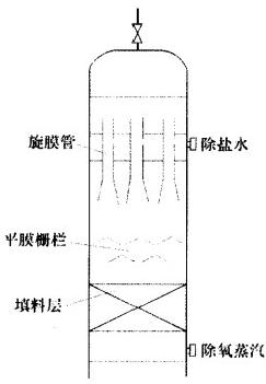 凝结水或除盐水进入起膜装置的水室后,以射流的方式由起膜管上的喷嘴进入起膜管,在内壁上形成高速向下旋转的水膜,向下流动的水膜与向上的加热蒸汽接触,迅速完成热交换。在起膜管内水基本被加热到相应压力下的饱和温度,此时水中的溶解氧(质量分数)被除掉85%以上。水膜旋出起膜管后在离心力和水膜惯性的共同作用下,水膜形成锥形裙体,继续受热,在向下旋转过程中,水膜受重力及蒸汽冲击力作用而破裂,以水滴形式向下降落并继续受热进入填料层进行二级除氧,此时水中的溶解氧(质量分数)又被除掉10%~13%。蒸汽进入水中使其沸腾,又可除去质量分数为1.0%~2.0%的溶解氧。可见,由于热力除氧器起膜的作用,液膜提前进入紊流状态,增强了传热条件,大量的汽化潜能很快地将液膜加热至饱和温度,热力除氧器的加热除氧过程,包含着传动、传热、传质的过程。对传质的要求则是以快的速度将不凝结气体全部从水中析出,热力除氧器为深度除氧创造了一个很好的传质条件。这是由于水在起膜器流速高、紊度大,液膜中的气体分子具有较大的动能,增大了气体克服表面张力的能力,而且又由于旋涡的不断卷吸,使液膜中的任何微团都能达到液面,给气体分子的离析逸出创造了条件。热力除氧器结构见图2。