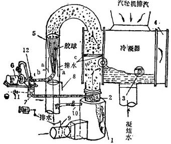 1、切向涡旋滤网2.胶球进口3.海绵胶球4.凝汽器水室5.收球网6.胶球泵7.装球室8.阻尼装置9.导向蝶阀10、11,排污阀门12,进口阀
