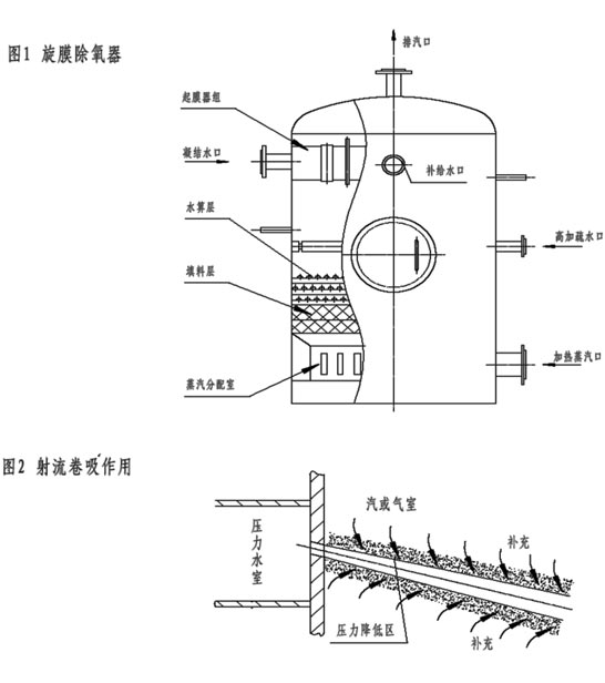 大气式除氧器也叫旋膜热力除氧器不同于其它类型热力除氧器(如喷雾式、溅盘式或喷雾填料式等)。关键之处在于其喷淋结构造成的汽水传热传质方式。旋膜热力除氧器入口水的喷淋方式采用起膜管装置,起膜管是旋膜除氧器的特性部件。除氧器入口水,在起膜管中形成射流、喷溅及旋膜,并在起膜管出口形成水膜裙,其传热系数远比其它类型热力除氧器大传热的同时伴随着传质。起膜管的设计,既考虑了液态传热、传质又考虑了汽态传质。